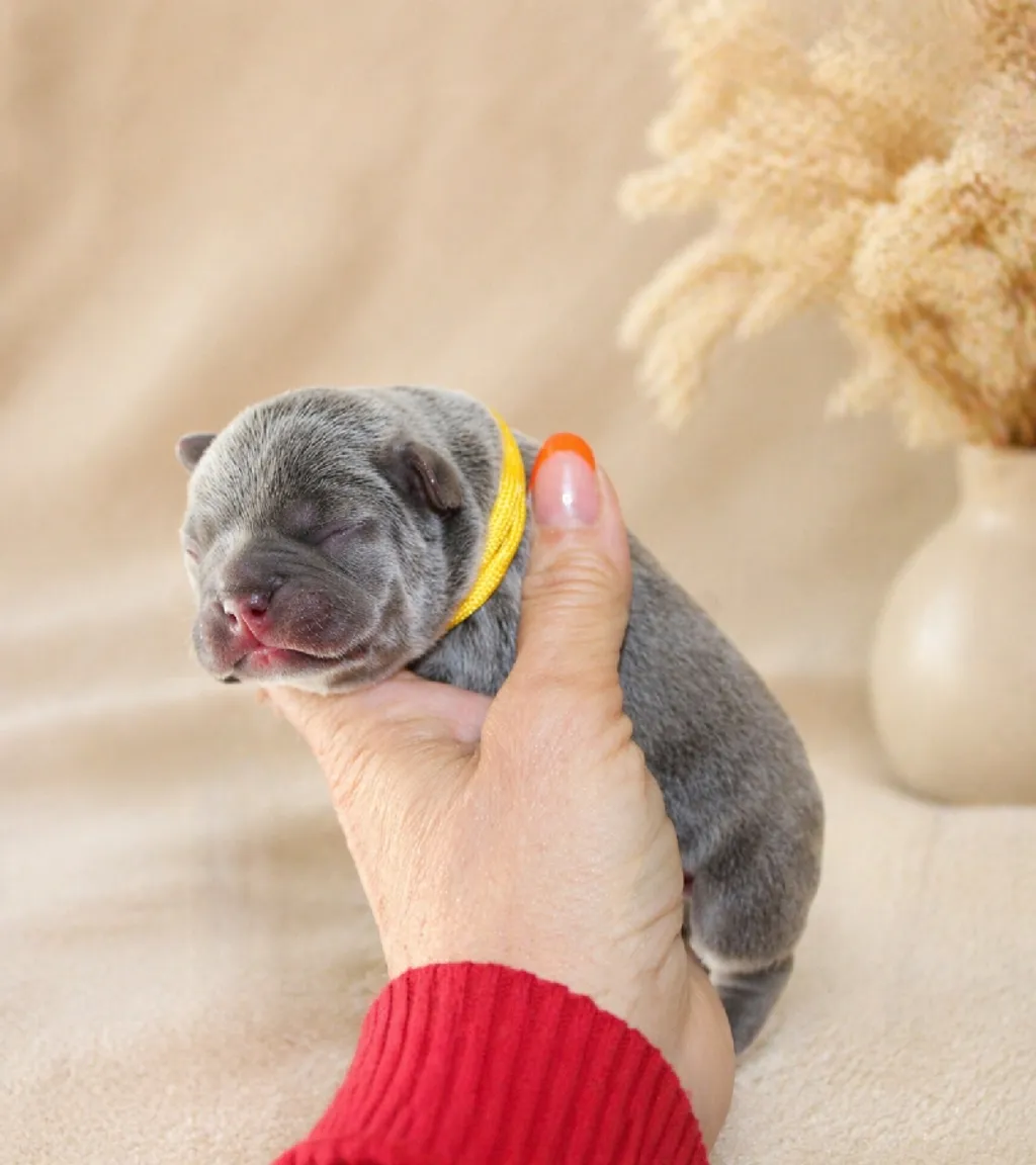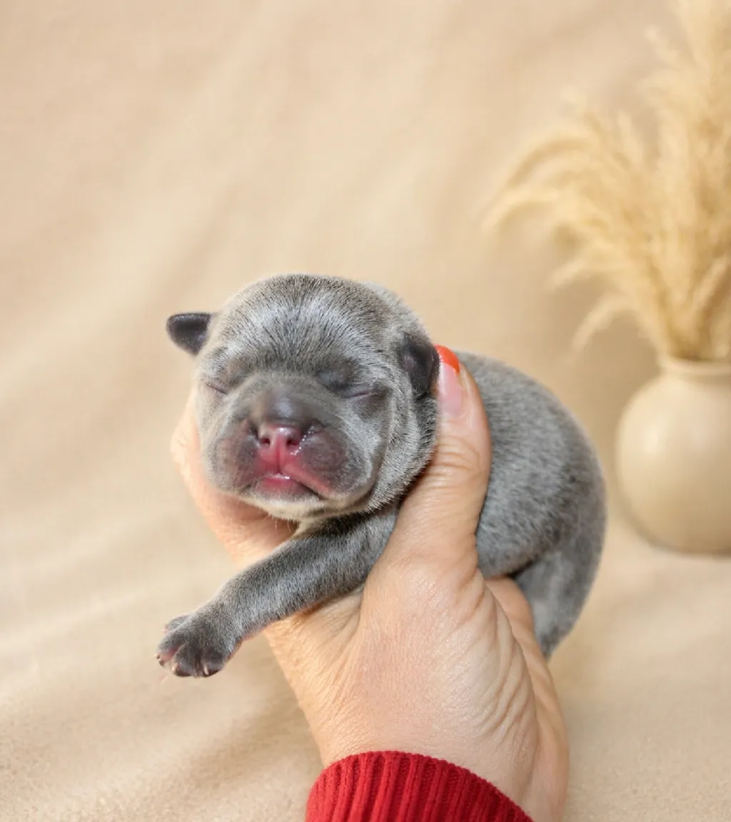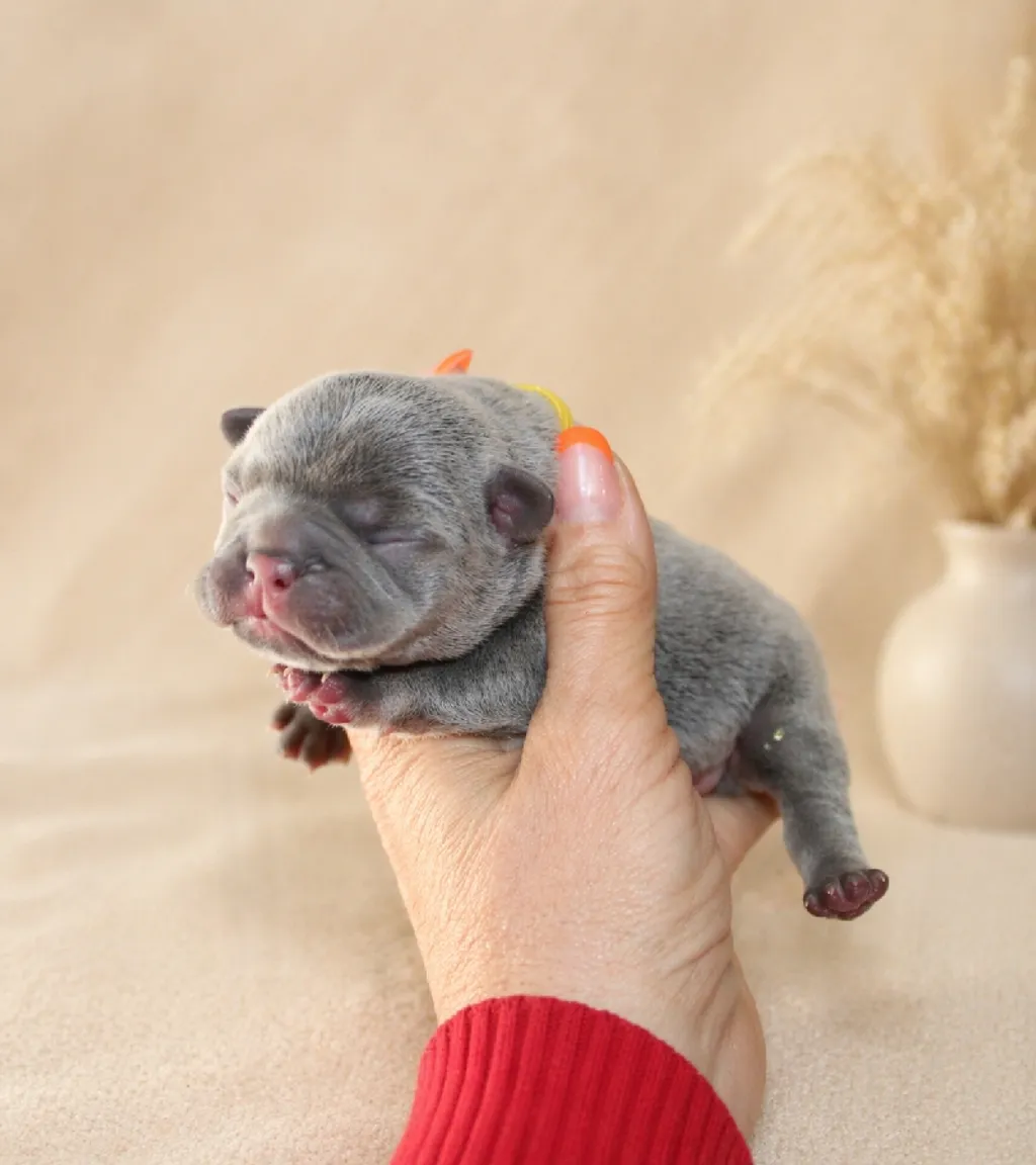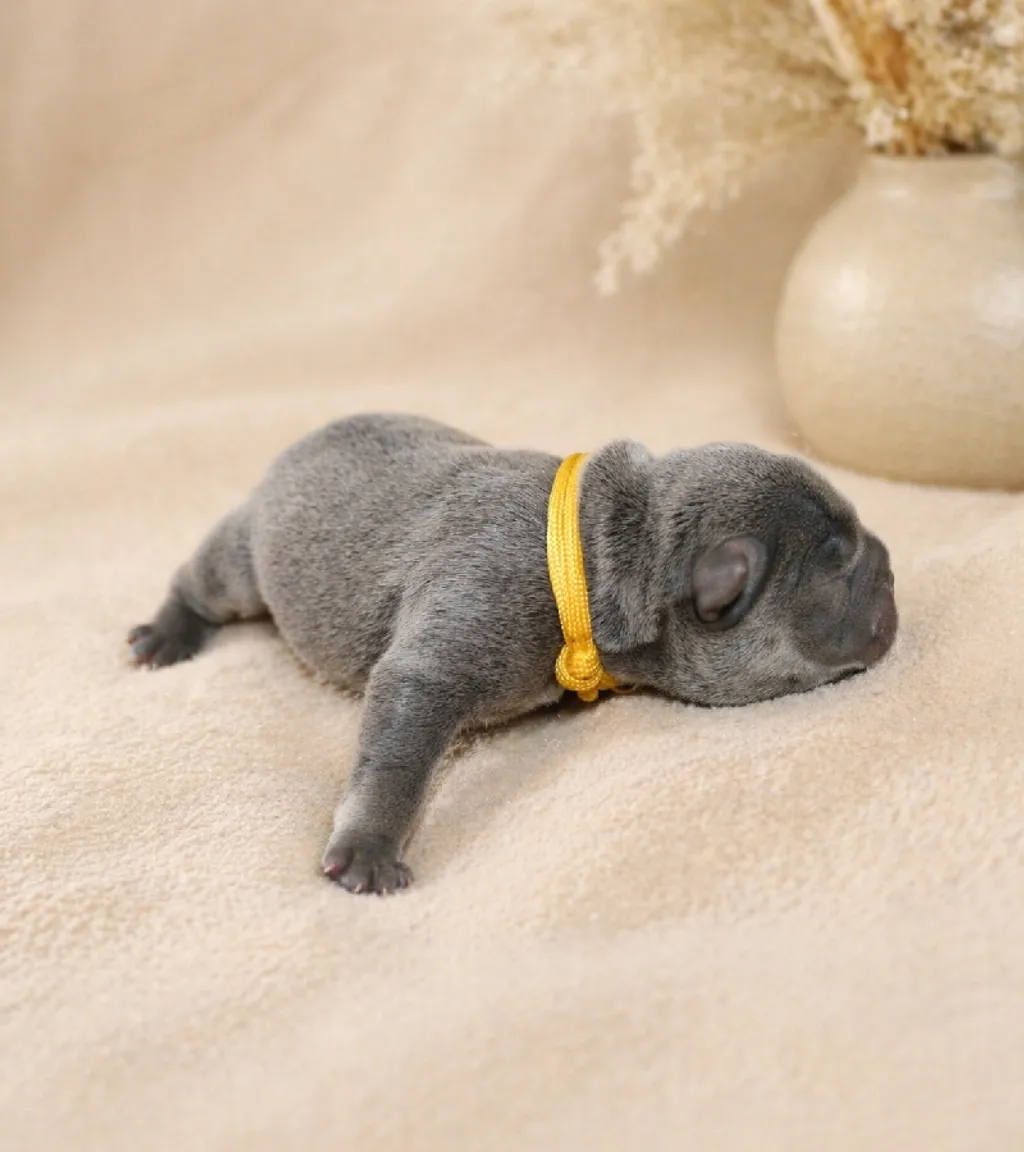Description du chiot : Aresk est un superbe mâle Bleu Tan, alliant élégance et prestance. Doté d’une morphologie harmonieuse et d’une ossature solide, il présente déjà de très belles qualités. Son type, sa construction et son allure en font un chiot prometteur, idéal pour les amateurs de Bouledogues Français au caractère et au style affirmés.
